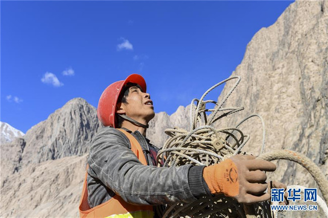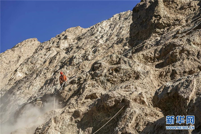 11月12日,在新疆塔什庫爾干塔吉克自治縣大同鄉(xiāng)鄉(xiāng)政府附近的一處路段,工人背著施工設(shè)備在峭壁上攀爬。 近日,一支由四川、云南等地工人組成的施工隊忙碌在帕米爾高原深處的大山中,為塔什庫爾干塔吉克自治縣縣城至大同鄉(xiāng)道路的易落石路段安裝防護(hù)網(wǎng)。崇山峻嶺間,工人要攀爬至峭壁上施工作業(yè),如躍動在大山間的“舞者”。據(jù)介紹,這支施工隊常年活躍在新疆山區(qū)道路的施工現(xiàn)場,為風(fēng)險路段加裝安全防護(hù)裝置,保障過往車輛和沿途村民出行安全。 新華社記者 胡虎虎 攝
