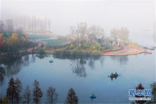 當(dāng)日,貴陽市出現(xiàn)大霧天氣,閱山湖公園內(nèi)的霧氣、林木、湖水呈現(xiàn)出一幅美麗的冬日畫卷。新華社記者 劉續(xù) 攝