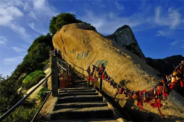 “自古華山一條路”則是經(jīng)典的登山路線,即從玉泉院出發(fā),經(jīng)五里關(guān)——莎蘿坪——毛女洞——青柯坪——回心石——千尺幢——百尺峽——老君犁溝——北峰——擦耳崖——蒼龍嶺——五云峰——金鎖關(guān),到達(dá)金鎖關(guān)后,便可登上中峰,以環(huán)線游覽東、西、南三峰。當(dāng)然,長空棧道和鷂子翻身也是必不可少的挑戰(zhàn)。