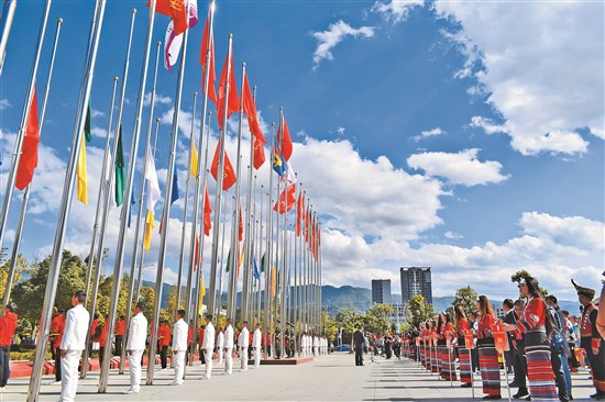 圖為省第十一屆少數(shù)民族傳統(tǒng)體育運(yùn)動(dòng)會(huì)代表團(tuán)升旗儀式在臨滄市體育運(yùn)動(dòng)中心體育場(chǎng)舉行。夏方海 攝