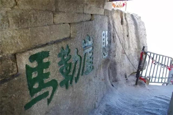 華山長(zhǎng)空棧道上下皆是懸崖絕壁,鐵索橫懸,由條石搭成尺許路面,下由石柱固定。由于棧道險(xiǎn)峻,故當(dāng)?shù)厝擞?ldquo;小心九厘三分,要尋尸首,洛南商州”之說。這里只是探險(xiǎn)之道,并非登山必由之路,膽小人就在升表臺(tái)看看也就行了。所以在長(zhǎng)空棧道的入口處,就有這樣一塊石刻,上邊刻著“懸崖勒馬”四個(gè)大字。懸崖勒馬的字面意思就是說在高高的山崖邊上勒住馬。比喻到了危險(xiǎn)的邊緣及時(shí)清醒回頭。面對(duì)長(zhǎng)空棧道這樣險(xiǎn)峻的地勢(shì),游人確實(shí)要比正常情況下更加清醒。