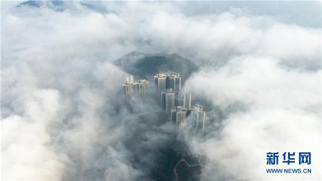 當(dāng)日,銅仁市萬山區(qū)上空出現(xiàn)平流霧景觀,建筑物、山巒在霧氣中若隱若現(xiàn)。新華社發(fā)(伍衛(wèi)東攝)