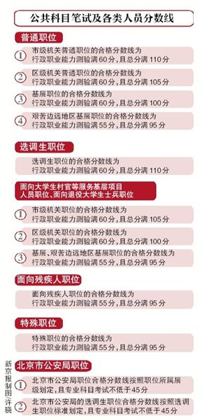 在日前公布的“京考”分數(shù)線中,市區(qū)兩級普通職位的合格分數(shù)線都要求行政職業(yè)能力測驗滿60分。市級普通職位總分要求滿110分,區(qū)級總分要求105分。分數(shù)線最低的是艱苦邊遠地區(qū)基層職位,其合格分數(shù)線為行政職業(yè)能力測驗滿55分,且總分滿95分。
