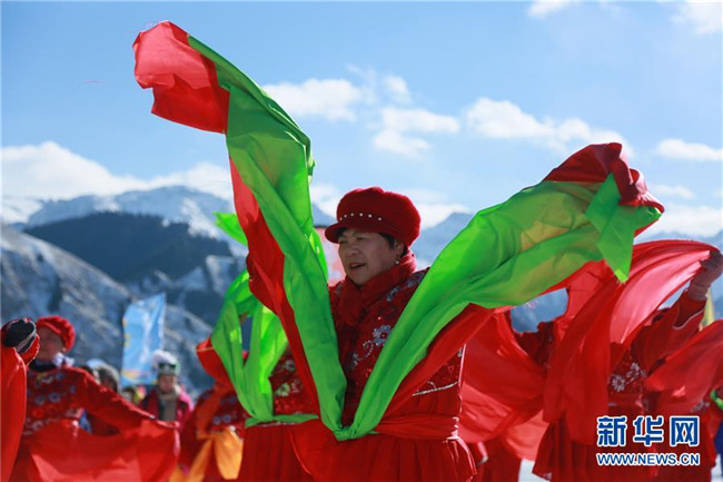 在天山天池景區(qū),老人在社火表演中跳秧歌舞(2月8日攝)。各地張燈結(jié)彩,處處歡聲笑語,地處中國西北邊陲的新疆各族群眾,新春佳節(jié)期間,耍社火、逛廟會、看演出、玩冰雪,載歌載舞,在濃濃的中華傳統(tǒng)文化氛圍中熱熱鬧鬧過大年。新華社發(fā)(周勇強(qiáng)攝)