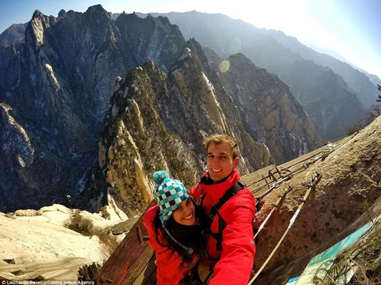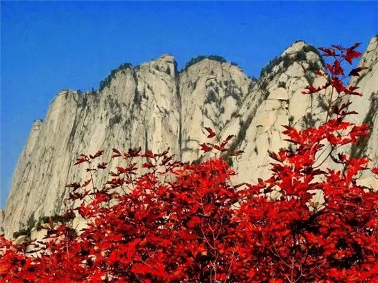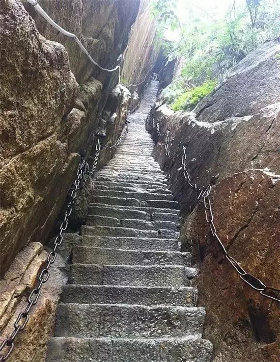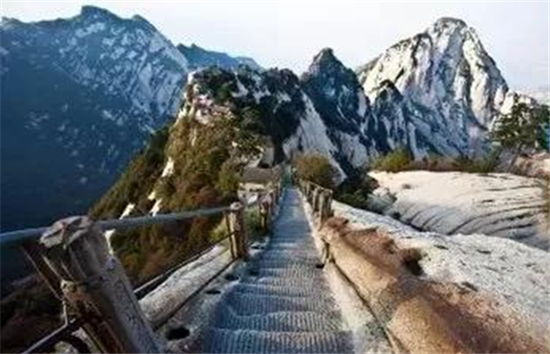 這是一個(gè)溫暖的美麗秋天,華山壯觀的峭壁在陽(yáng)光下閃閃發(fā)亮,稀有樹(shù)木炫耀著多彩的秋葉,遠(yuǎn)方跳躍的瀑布吸引著游客的眼球,奇形怪狀的點(diǎn)點(diǎn)白云在腳下緩緩流動(dòng)。我和我的朋友開(kāi)始了一場(chǎng)艱苦的旅行,一起攀登6,600多級(jí)鑿在巖石上的臺(tái)階,目標(biāo)是海拔2154.9米南峰之巔祭祀華山神的道觀?! ?