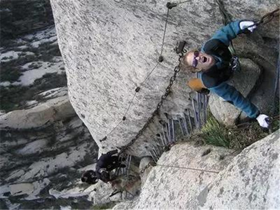 華山道路最危險(xiǎn)的地方當(dāng)屬“長(zhǎng)空棧道”,13英尺長(zhǎng),1英尺寬的木板就修在垂直的懸崖之上。在那里的一個(gè)失足就會(huì)使你墜入下面的萬(wàn)丈深淵。棧道上有安全帶加以保護(hù),如果你想冒險(xiǎn)嘗試,綁上安全帶并把你系在繩索上,在一些地段,僅有一條安全帶和一些鑿在石頭里的腳窩作為支撐。