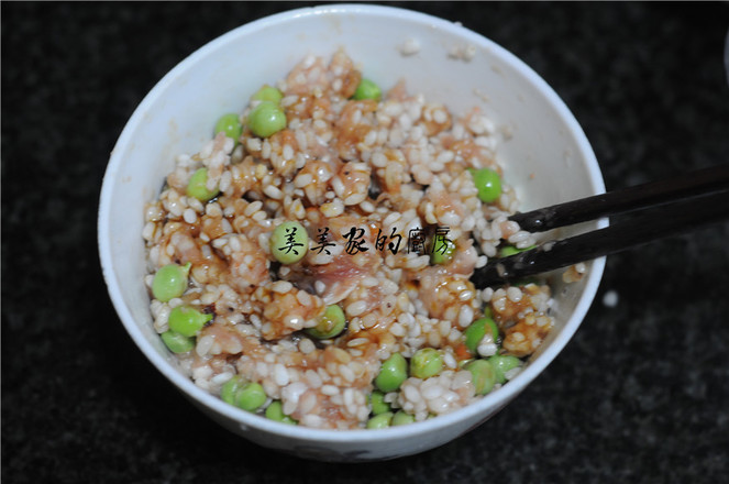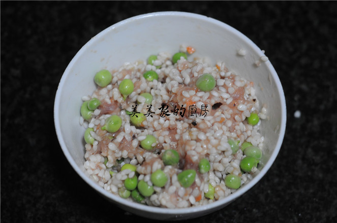 2.泡好的糯米從水里撈出來,加入青豆和豬肉末。