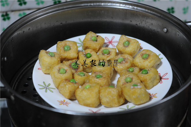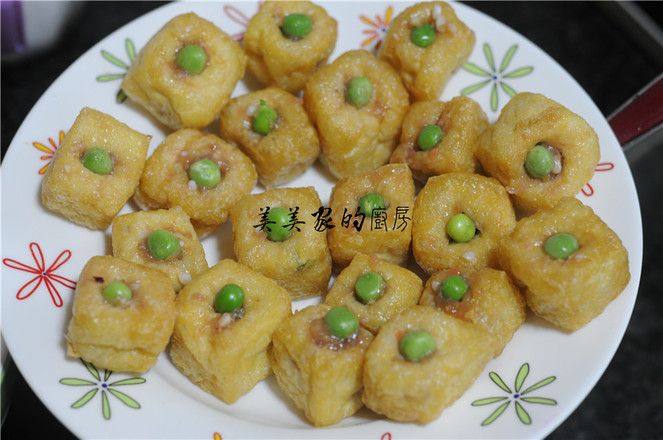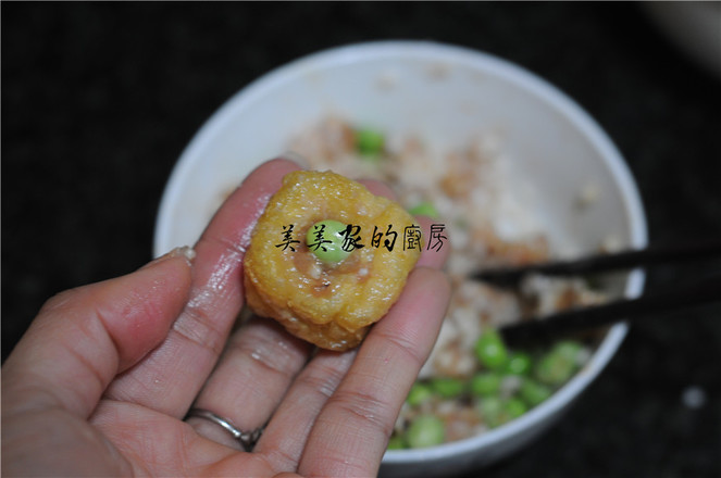 4.油豆腐表面用筷子撮一個洞,將拌好的餡慢慢塞入油豆腐里,盡量塞滿,在洞口上塞上一顆青豆裝飾。