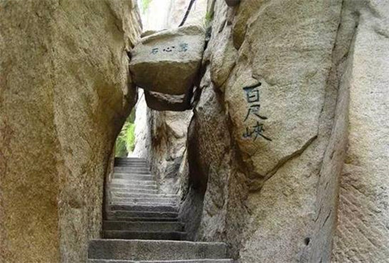 幢去峽復(fù)來,天險(xiǎn)不可瞬。雖云百尺峽,一尺一千仞。”過千尺幢向北折即到“百尺峽”,它也叫“百丈崖”,仍是一處危石聳峙,直插云表,令人望而生畏的地方。峽的兩壁欲合,卻被飛來的兩顆石塊從中撐開,人從石頭下鉆過,膽戰(zhàn)心驚,生怕石塊從兩壁間掉下來,這就是“驚心石”。通過此石懸著的心才放下來,再回頭看原來此處卡著的兩塊石頭,是上大下小故能安然無恙,所以這顆石頭也被稱之為“平心石”。故韓愈詩中有“俄然神功就,殺氣見棱角”的描寫。