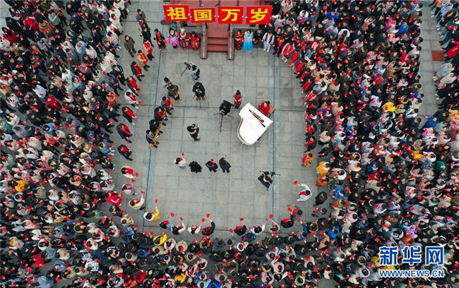 2月25日,湖南省衡陽(yáng)市南華大學(xué)師生在開(kāi)學(xué)主題活動(dòng)上齊唱《我和我的祖國(guó)》(無(wú)人機(jī)拍攝)。  新華社發(fā)(曹正平 攝)