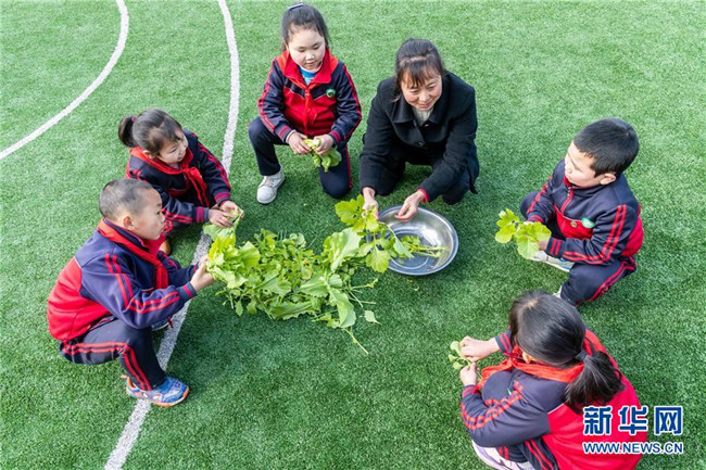 2月25日,在重慶市南川區(qū)慶元鎮(zhèn)福壽村小,教師黃先群和孩子們清洗他們?cè)谛@里種的蔬菜,為午飯做準(zhǔn)備,這所“微小學(xué)”只有一名教師和五名學(xué)生。新華社發(fā)(瞿明斌 攝)
