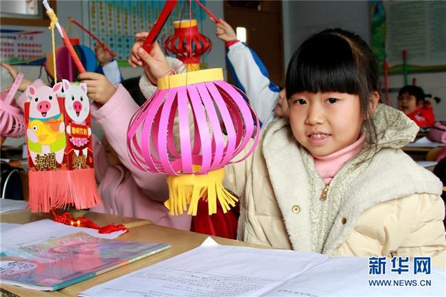2月25日,在山東青島西海岸新區(qū)第二實(shí)驗(yàn)小學(xué),學(xué)生在開(kāi)學(xué)第一課上展示自己制作的春節(jié)主題作品。新華社發(fā)(王培珂 攝)