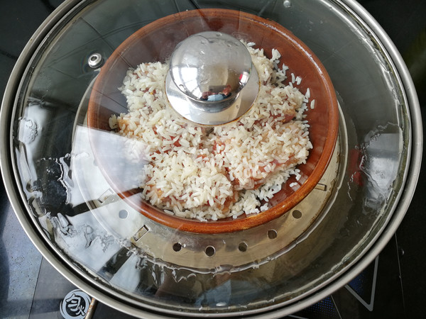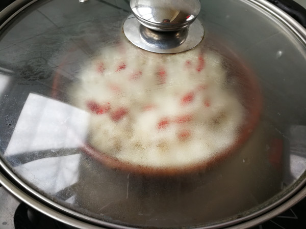 6.大火燒開水,把排骨糯米蒸一小時左右,再撒入枸杞子,再燜蒸30分鐘