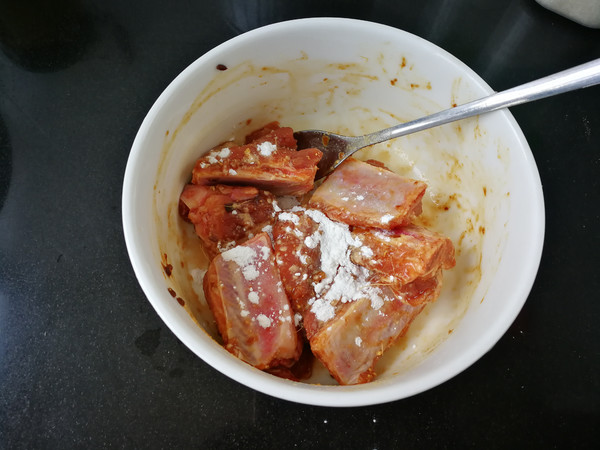 2.把砍成段的排骨泡去血水,加入調(diào)味料、一點油拌好,腌上20分鐘