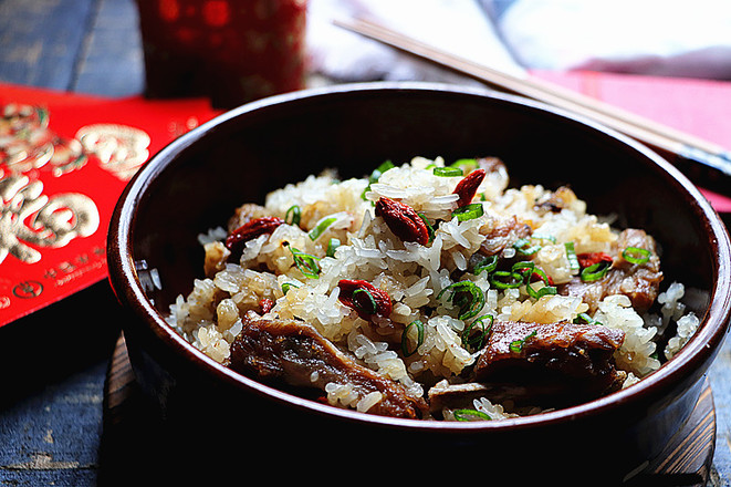 7.蒸好的排骨糯米飯取出淋點醬油、撒下蔥花,再用筷子打松排骨與飯粒,即可食用