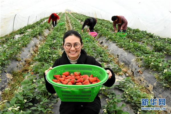 2018年2月27日,王萌萌展示剛采摘的草莓。全國人大代表王萌萌是安徽省定遠縣西孔村一名大學生“村官”,她帶領村民建立起草莓園、蔬菜園、育秧工廠等特色項目,吸引游客前來采摘,村民的日子越過越紅火。 新華社發(fā)(馮再雷 攝)