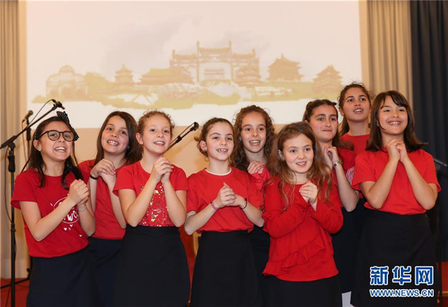 這是2019年2月8日,在意大利拉齊奧的古鎮(zhèn)蒂沃利,蒂沃利國立住讀學校的學生們在中國春節(jié)慶祝活動上給大家拜年。 新華社記者 程婷婷 攝