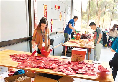 春節(jié)那天,學(xué)校為中國留學(xué)生安排了新春活動(dòng),準(zhǔn)備了很多裝有金幣巧克力的紅包,派送的小餅干里還夾著新年祝福;不經(jīng)意間,我驚喜地發(fā)現(xiàn),墻面上還藏了許多謎語。對(duì)于過年還要上課的我們來說,這已是最大的“年味”了。