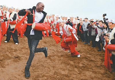 在陜西延安安塞區(qū)南溝進(jìn)行的一場腰鼓演出結(jié)束后,一名外國游客與當(dāng)?shù)匮氖止餐蚱鹆搜?。新華社記者 劉 瀟攝