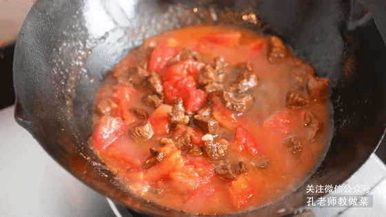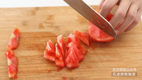 5.鍋中適量油燒熱,下入番茄塊翻炒至出汁。(將番茄去皮做出來(lái)口感更好,在番茄頂部輕劃“十”字,放入熱水鍋中煮2-3分鐘,煮至表皮褶皺裂開,取出番茄晾涼后就可以輕易的撕下外皮了。)