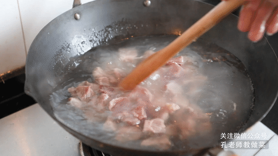 3.鍋中涼水,下入切好的牛腩,倒入料酒,煮至血水和浮沫溢出,撈出牛腩沖洗干凈。