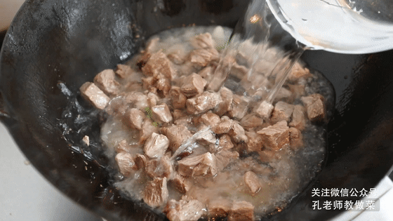 6.倒入牛腩塊,加一大碗清水,調(diào)入白糖和鹽,大火煮開后轉(zhuǎn)小火煮約30分鐘,煮至用筷子輕易戳透牛腩即可。