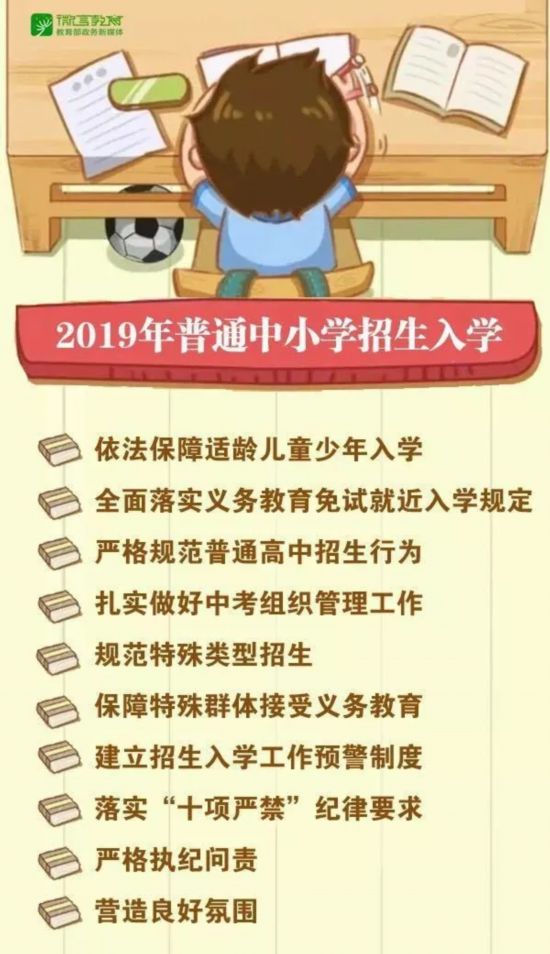 教育部辦公廳印發(fā)《關(guān)于做好2019年普通中小學(xué)招生入學(xué)工作的通知》。《通知》提出依法保障適齡兒童少年入學(xué)、全面落實義務(wù)教育免試就近入學(xué)規(guī)定、嚴格規(guī)范普通高中招生行為、建立招生入學(xué)工作預(yù)警制度、嚴格執(zhí)紀問責(zé)等要求。