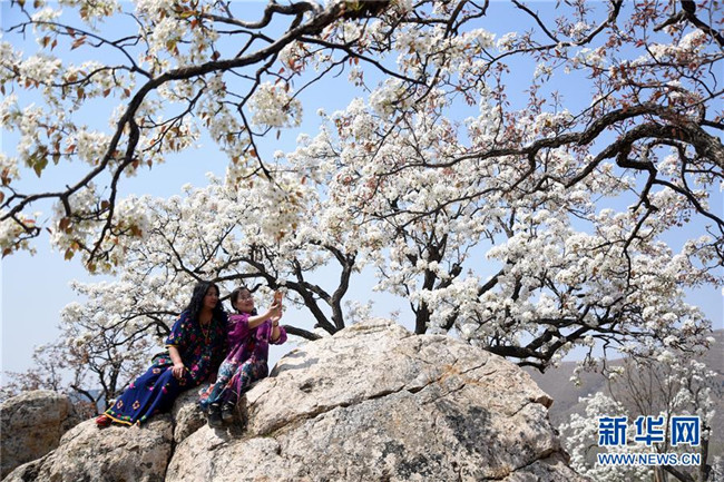 4月1日,在山東省沂南縣馬牧池鄉(xiāng)西寺堡村,游客在梨園內(nèi)賞花拍照。 新華社發(fā)(杜昱葆 攝)