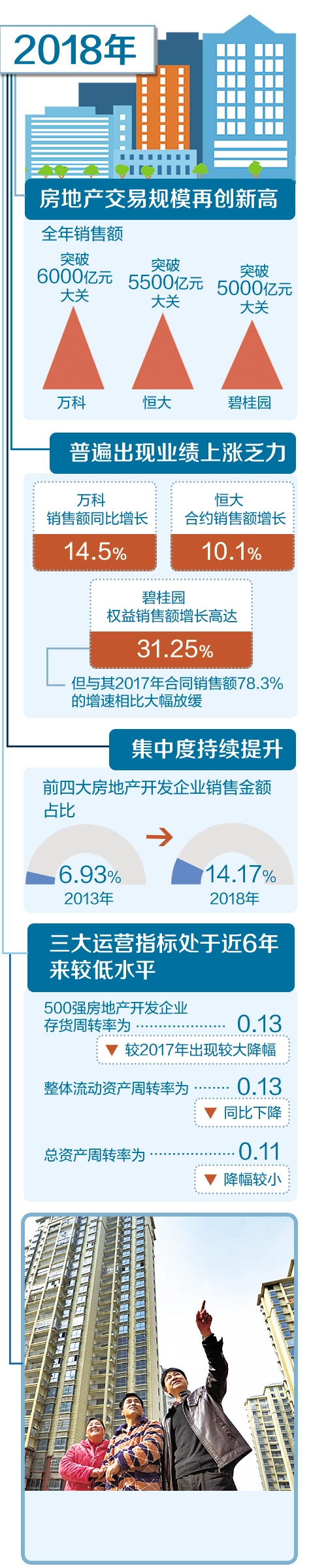 “活下去”。龍頭房企萬科在去年作出了房地產(chǎn)行業(yè)轉(zhuǎn)折已經(jīng)到來的判斷。雖然萬科發(fā)出的聲音略顯夸張,但隨著我國房地產(chǎn)調(diào)控長(zhǎng)效機(jī)制不斷完善,房地產(chǎn)行業(yè)的“黃金時(shí)代”正在漸行漸遠(yuǎn)。近日密集發(fā)布的上市房企年報(bào)顯示,多數(shù)房企在營(yíng)收、利潤(rùn)方面業(yè)績(jī)理想,但銷售額增幅在逐步告別高增長(zhǎng),進(jìn)入中速增長(zhǎng)。在行業(yè)集中度不斷提高、行業(yè)增速放緩的情況下,聚焦主業(yè)、精細(xì)化運(yùn)營(yíng)、提升品質(zhì)、多元化布局成為各大房企角力的關(guān)鍵詞。
