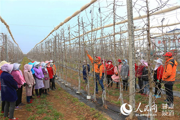 4月4日,寧縣焦村海升模式現代農業(yè)高科技示范園技術人員正在培訓春季果園管理技術。(李綱陵 攝)