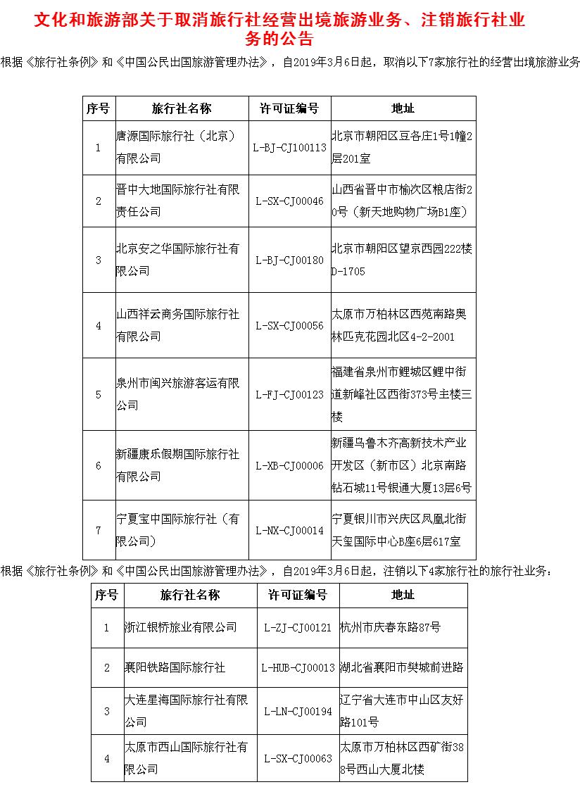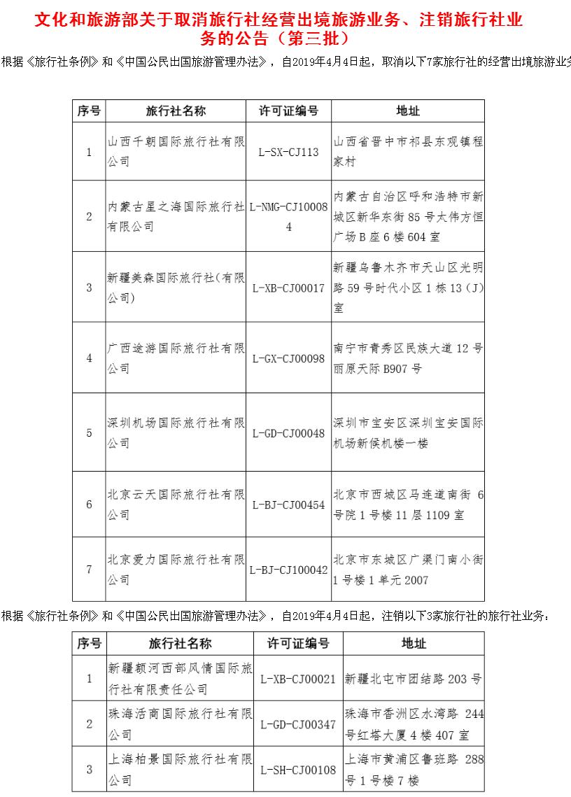 文化和旅游部近日發(fā)布公告,取消7家旅行社的經(jīng)營出境旅游業(yè)務(wù),注銷3家旅行社的旅行社業(yè)務(wù)。記者注意到,截至目前,今年文化和旅游部共取消30家旅行社的出境游業(yè)務(wù)、注銷11家旅行社的旅行社業(yè)務(wù)。戳圖看詳細(xì)黑名單。