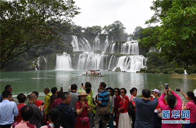 4月17日,游客在大新縣德天瀑布景區(qū)游覽。