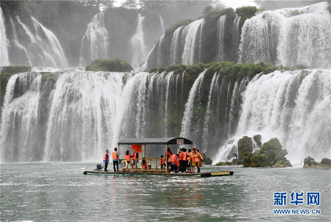 近日,隨著降雨增多,位于中越邊境的廣西大新縣德天瀑布水量增大,吸引大批游客前來觀光游覽。新華社記者 陸波岸 攝