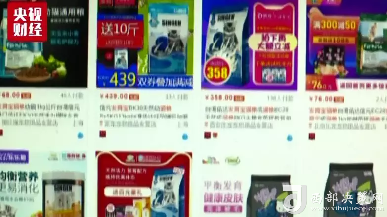 在網(wǎng)購平臺搜索寵物日常糧食用品,商品數(shù)量可達(dá)上百頁。銷量最好的貓糧,月銷售量達(dá)到6.5萬筆。
