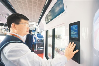 2019中國(guó)(上海)國(guó)際技術(shù)進(jìn)出口交易會(huì)上,工作人員在智能熊貓巴士上演示利用掌脈進(jìn)行購物。龍巍 攝(人民視覺)