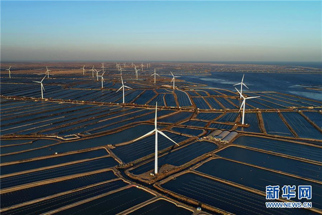 這是河北省唐山市樂亭縣姜各莊鎮(zhèn)海邊養(yǎng)殖區(qū)內(nèi)的風電場(2018年11月10日無人機拍攝)。新華社記者 楊世堯 攝