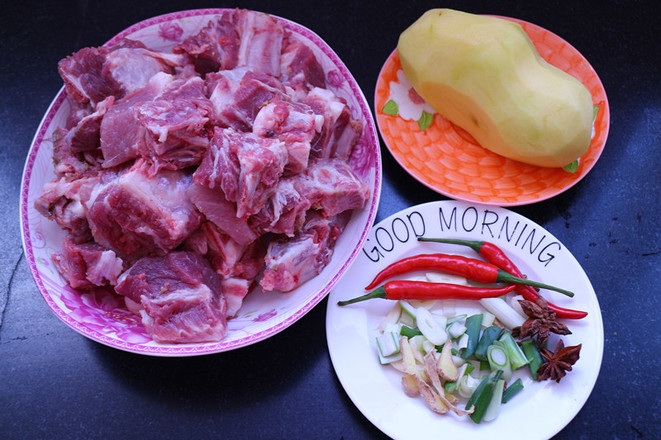 1.準(zhǔn)備食材:排骨一斤,土豆一個,蔥姜段少量,八角兩粒,紅辣椒2.3個