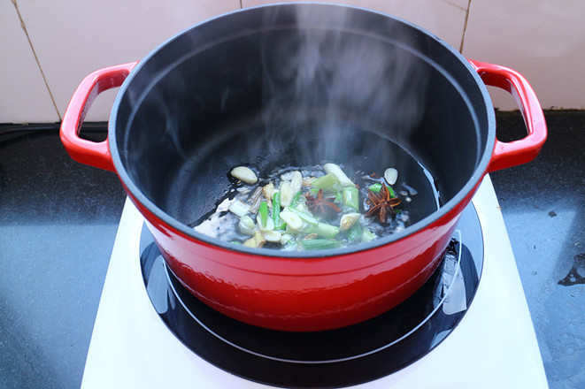4.鍋里倒油,蔥花爆鍋,放入八角
