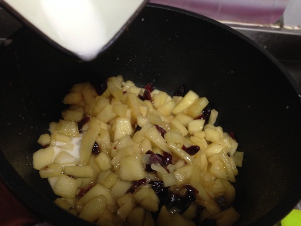 5.煮至蘋(píng)果軟蔫半透明時(shí)倒入蔓越莓干拌勻