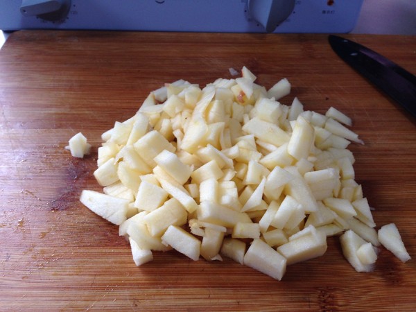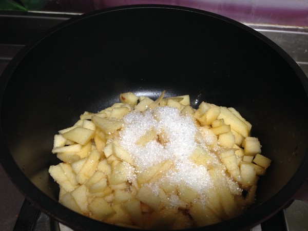 6.倒入少許水淀粉收汁冷卻備用,加入水淀粉可以讓蘋(píng)果丁口感會(huì)更綿滑