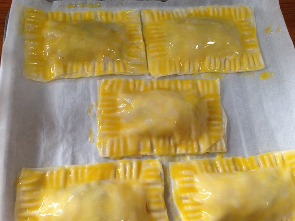 10.烤盤(pán)鋪油紙放入蘋(píng)果派,表面刷蛋黃液