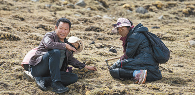 崔久鄉(xiāng)的拉姆(右一)等牧民,在剛?cè)谘┎痪玫纳狡虏莸厣蠈ふ蚁x草。 |