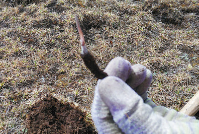 發(fā)現(xiàn)蟲草后,拉姆用鋤頭小心地翻起一塊草皮,拔出了一根蟲草。 |