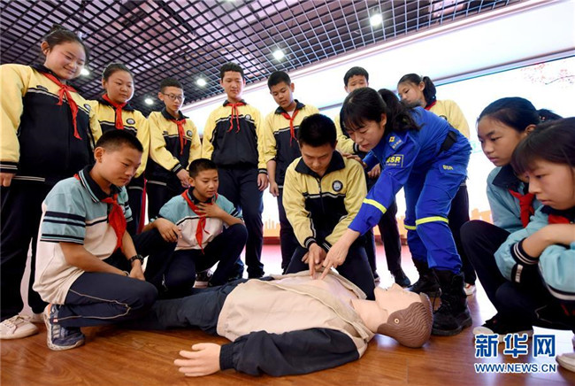 5月12日,邢臺市第八中學學生在藍天救援隊隊員的指導(dǎo)下學習心肺復(fù)蘇急救技能。 新華社記者 朱旭東 攝