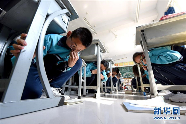 5月12日,邢臺市第八中學學生在進行模擬防震減災(zāi)演練。新華社記者 朱旭東 攝