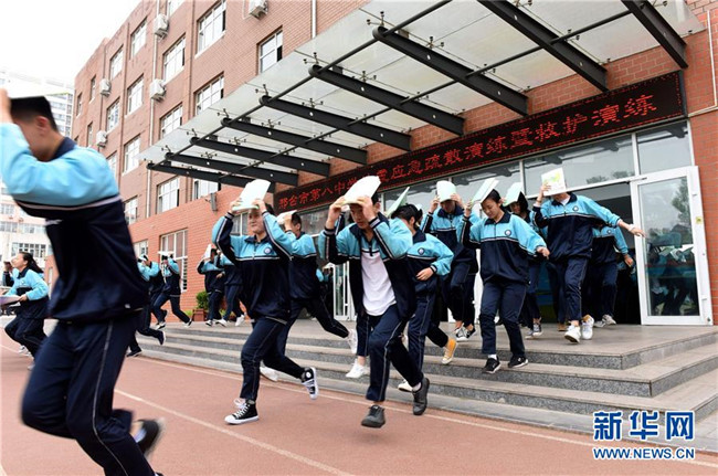 5月12日,邢臺市第八中學學生在進行模擬緊急疏散演練。新華社記者 朱旭東 攝