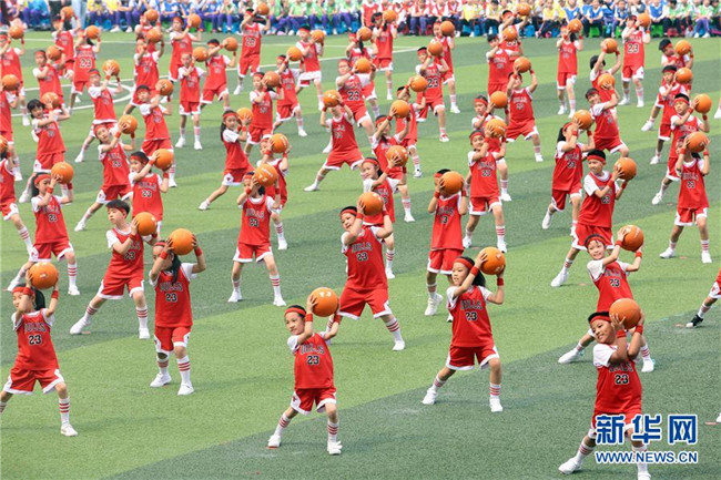 5月12日,天津市和平區(qū)岳陽道小學學生在運動會上展示集體籃球操。