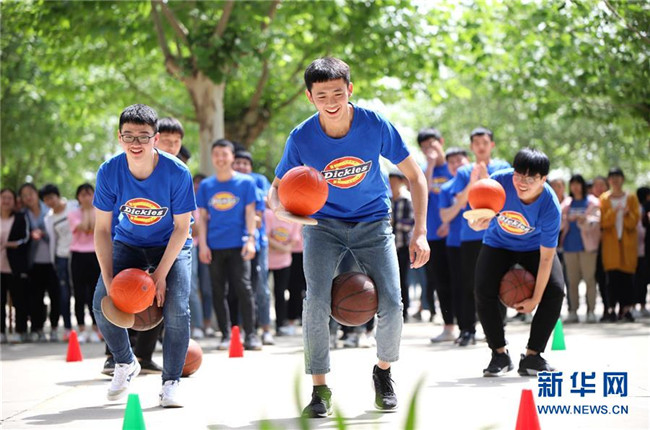 5月14日,河北省石家莊新樂市第二中學(xué)高三學(xué)生在進(jìn)行趣味運(yùn)球比賽。 新華社發(fā)(賈敏杰 攝)