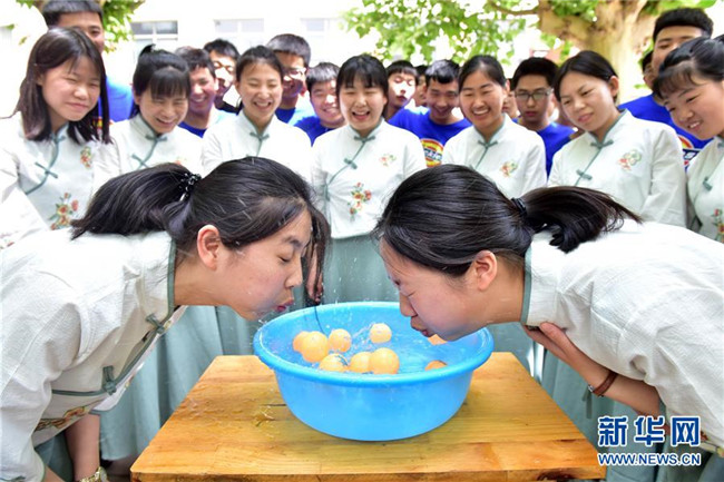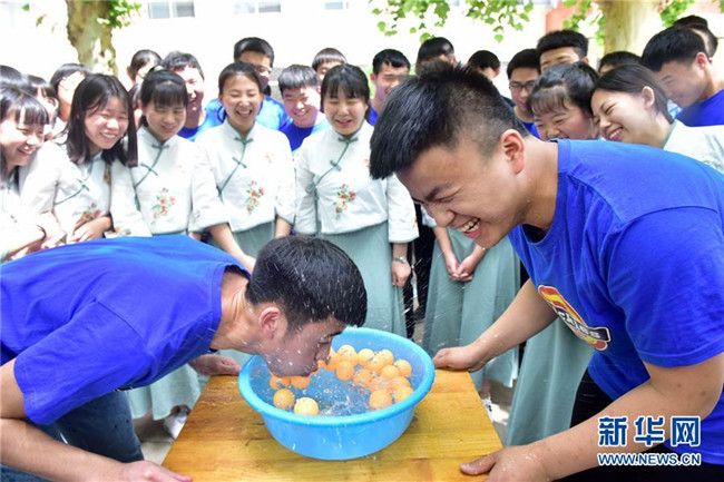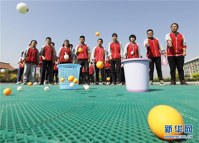 5月14日,河北省唐山遵化市堡子店中學(xué)高三學(xué)生在進(jìn)行投乒乓球游戲。 新華社發(fā)(劉滿倉 攝)