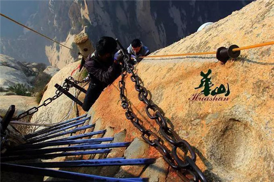 華山長空棧道位于華山南峰東側(cè)山腰。相傳,是華山派第一代宗師元代高道賀志真為遠(yuǎn)離塵世靜修成仙,在萬仞絕壁上鑲嵌石釘搭木椽而筑。棧道上下皆是懸崖絕壁,鐵索橫懸,由條石搭成尺許路面,下由石柱固定,游人至此,面壁貼腹屏氣挪歩,是“全球十大恐怖的懸崖步道”之一。